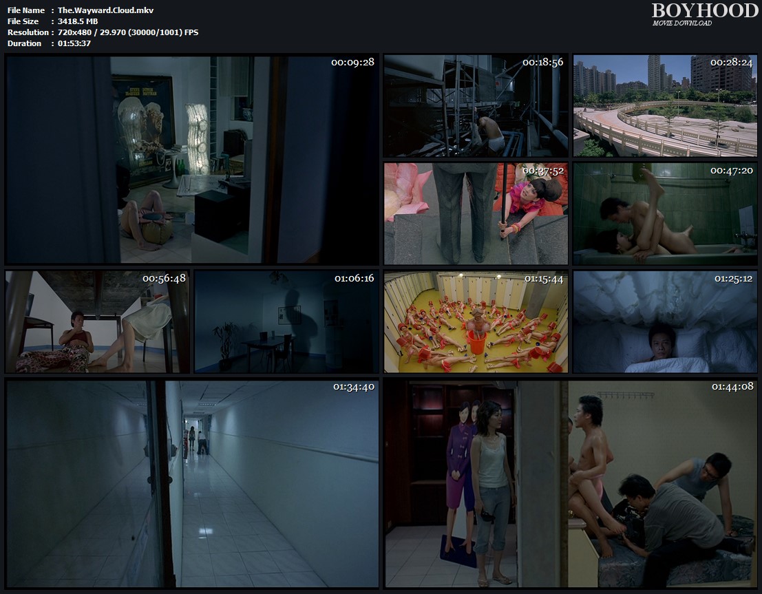Metaphor, allegory. There’s a drought in Taiwan. Watermelon are abundant and become juice, food, something to share with a guest, and an aphrodisiac. In a large building of flats, Hsiao-Kang and Shiang-chyi’s paths cross; she knew him when he sold watches, now he acts in pornographic films. She scavenges for plastic water bottles. He bathes in the building’s cistern. Fantasy song and dance numbers punctuate the characters’ nearly aimless pursuits: she has lost her keys and he helps her find them; he naps in a park, she watches; he smokes on the floor beneath her kitchen table while she sits. His film-making continues. Can they connect?