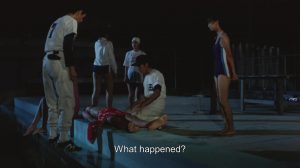 The setting is a “new” Tokyo suburb. The school is clean, well run, and the movie takes place in the five-day period before, during and after a ferocious, seemingly liberating typhoon, which five of the students endure while marooned in the school’s gymnasium.