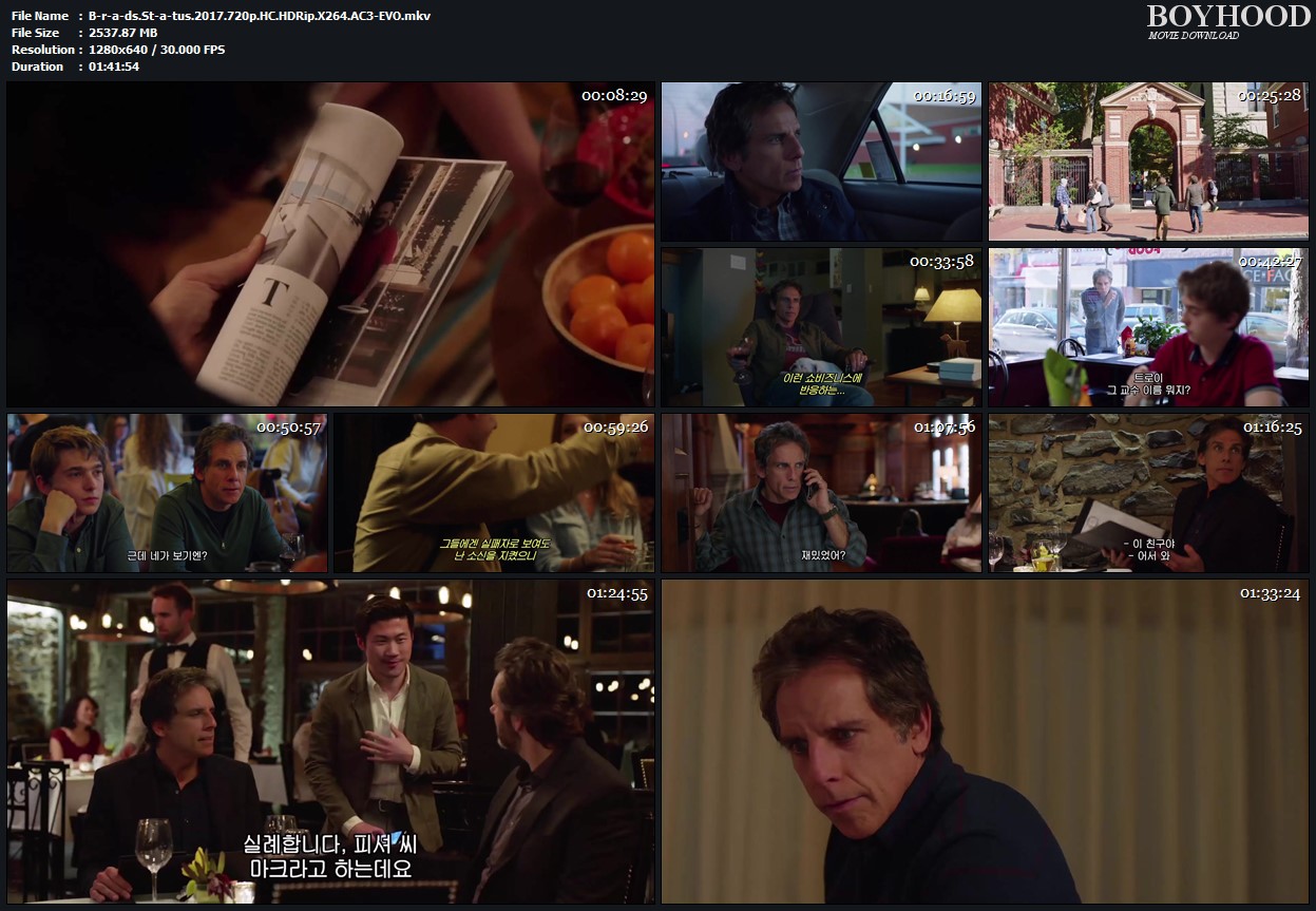 “Brad’s Status ” (2017 release; 101 min.) brings the story of Brad and his HS senior kid Troy on a college-shopping trip. As the movie opens, Brad, a middle-age guy in Sacramento who runs a very small non-profit agency, tosses and turns in bed while he thinks about the wealth and fame his college friends from yesteryear gained. Next morning, Brad and Troy fly out to Boston for the first of several college campus visits and interviews. Troy’s HS adviser thinks that Troy is Harvard-worthy, much too Brad’s delight. But when they get to Harvard, it turns out that Troy had mixed up the dates and hence he is denied an interview. Brad decides to pull out all stops and contacts his erstwhile college friend (and now TV personality) Craig… At this point we’re less than 15 min. into the movie, but to tell you more of the plot would spoil your viewing experience, you’ll just have to see for yourself how it all plays out.